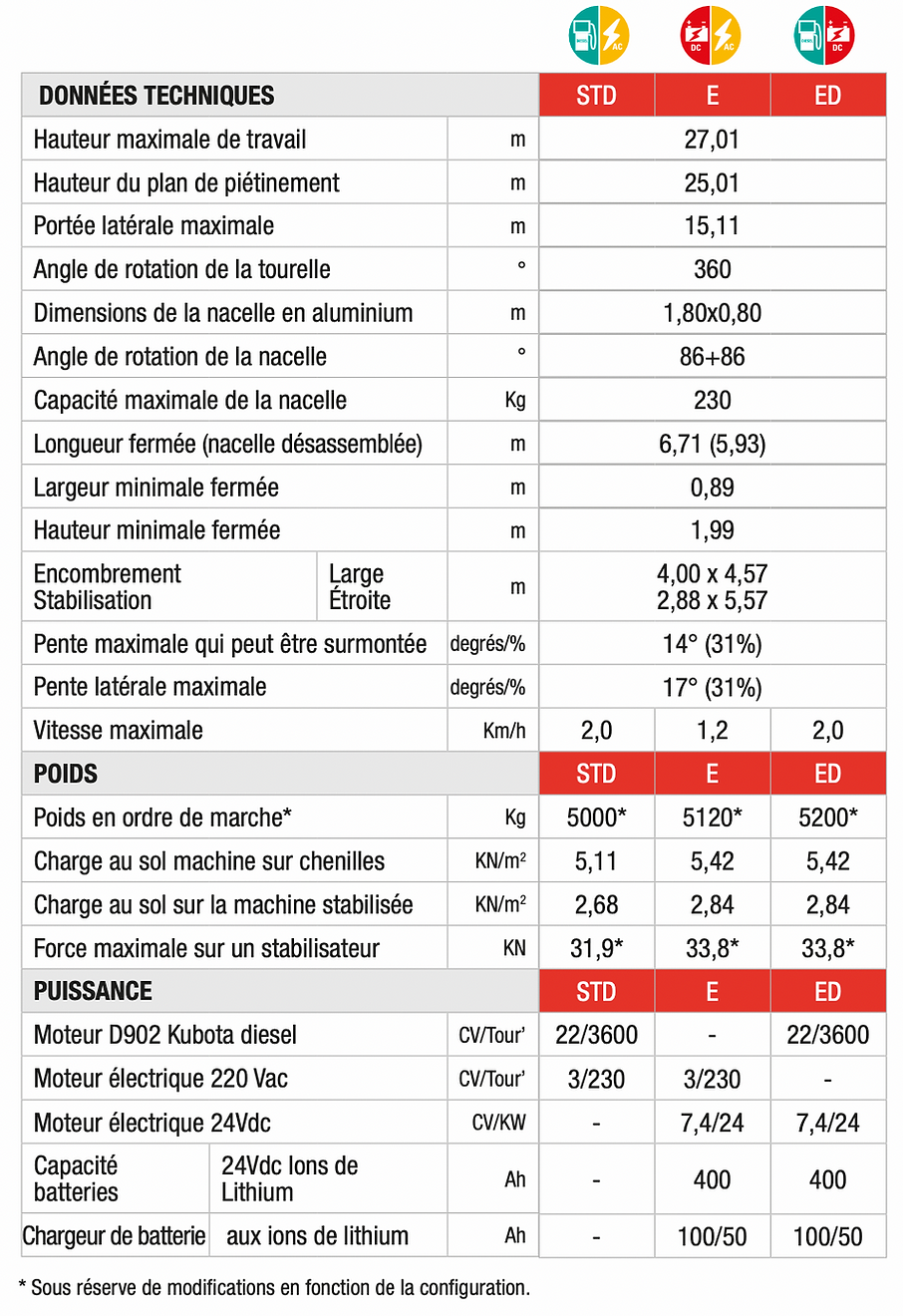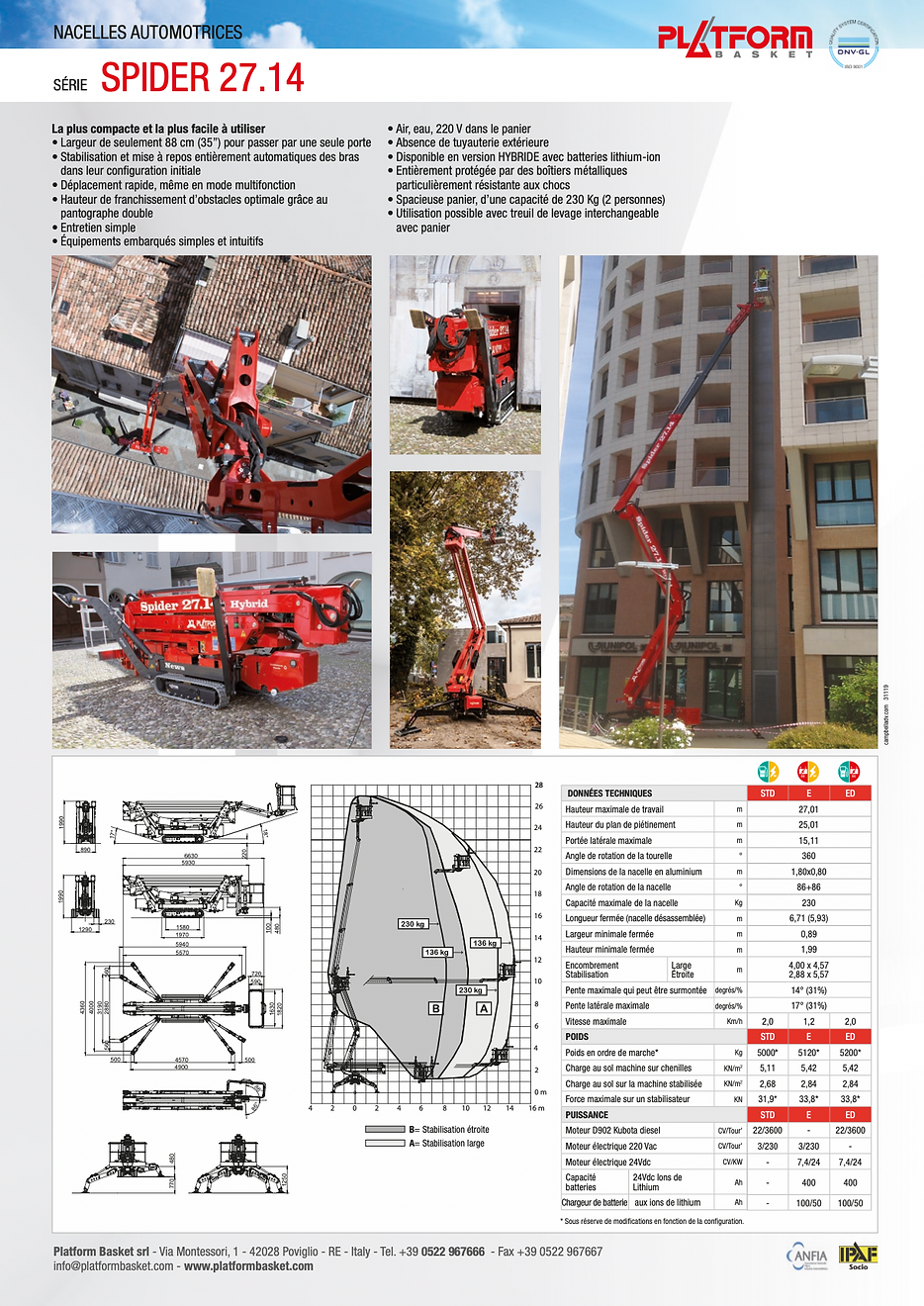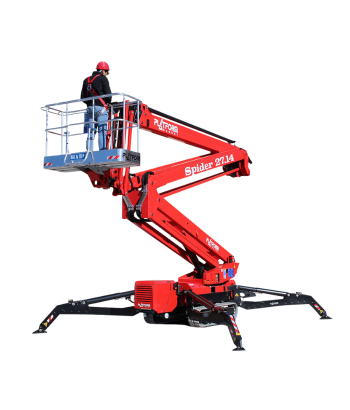 Un encombrement minimum, et un déport maximum. Compacte et légère, elle est simple à utiliser dans toutes les situations grâce à sa stabilité en hauteur incomparable. Ses points forts : une stabilisation très-compacte et aucun encombrement en rotation. Elle est agile et stable sur chenilles. Grâce à un dispositif automatique de contrôle du déport, le système s’occupe d’augmenter ou réduire le déport en fonction de la charge dans le panier. La rotation de la tourelle de 360° permet au bras équipé du jib un travail dans toutes les conditions puisque il n’y pas de porte-à- faux par rapport à la stabilisation. Le concept de fabrication se base sur une simple télécommande contrôlée par câble pour le déplacement. Chaque élément de la nacelle à été fabriqué et peint précisément pour vous fournir la meilleure qualité. Le châssis chenillé peut être livré avec élargissement hydraulique contrôlé par un distributeur manuel de commande (option). En quelques secondes il est possible de monter et démonter le panier en aluminium très léger.